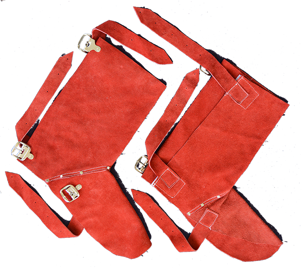 Red split leather apron with buckle.